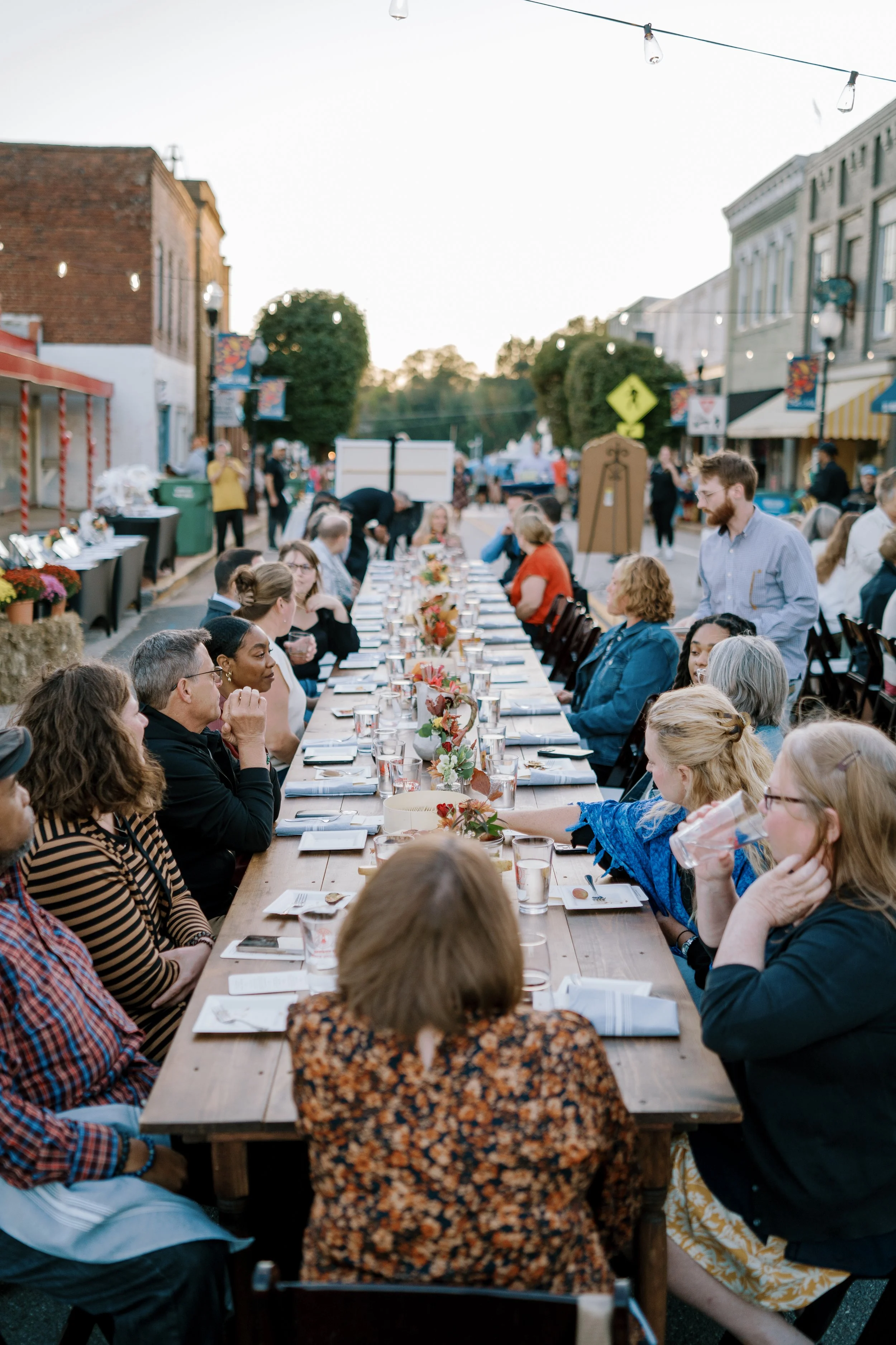 A long table dinner under the lights where the whole community comes together.
